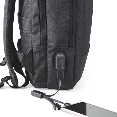 Com divisórias internas para acessórios, a mochila possui suporte externo USB, alça para engate em malas de viagem e duas alças de mãos, sendo uma delas para o transporte da mochila no formato pasta.
